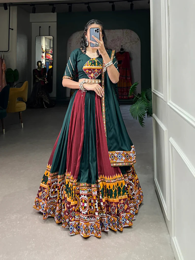 Green Vibrant Printed Silk Lehenga with Gamthi & Mirror Work