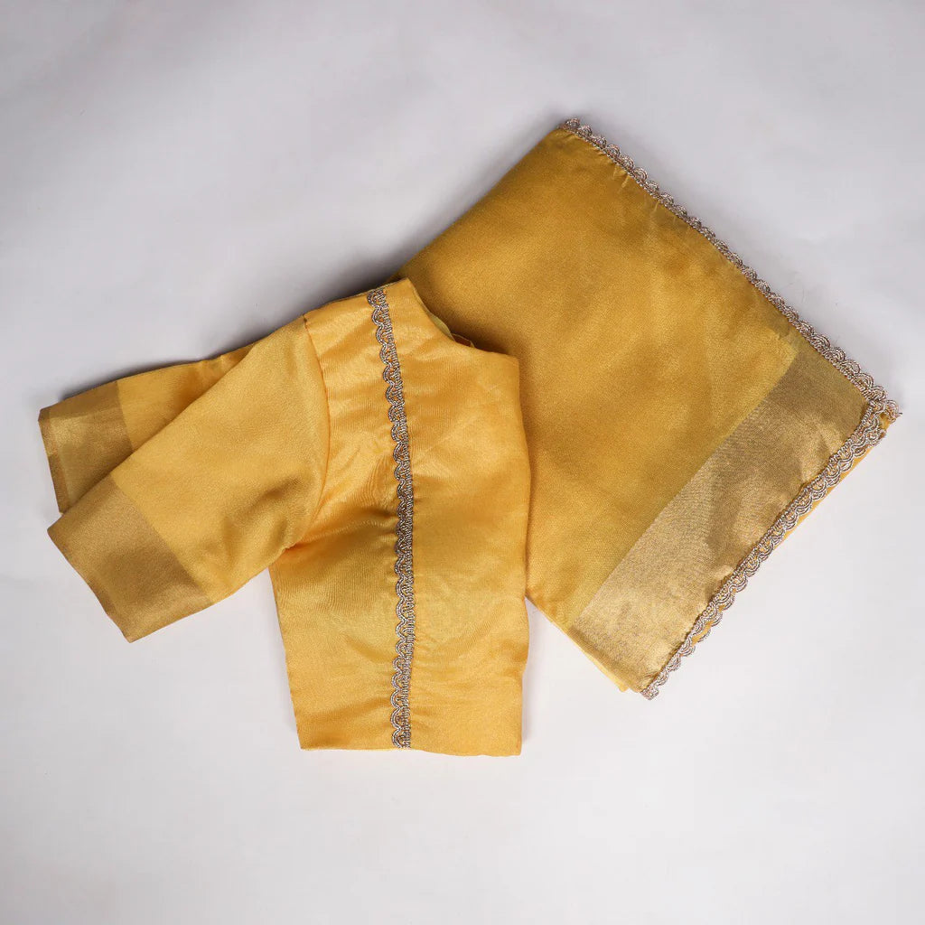 This saree is perfect for a variety of special occasions, including weddings, festivals, cultural ceremonies, or a sophisticated evening out. The unstitched blouse allows for complete customization, ensuring a perfect fit that flatters your unique silhouette. The matching Mannat silk blouse fabric echoes the design of the saree, featuring plain elegance with zari weaving work and a charming lace border.