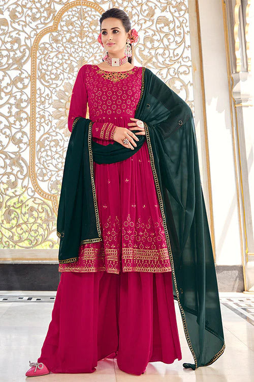 Look fashionable in this Rani Georgette Thread And Sequins Embroidered Kurta Palazzo Set. Crafted with Georgette fabric, this set displays intricate thread and sequins embroidery for a chic look. Perfect to flaunt your style with confidence.